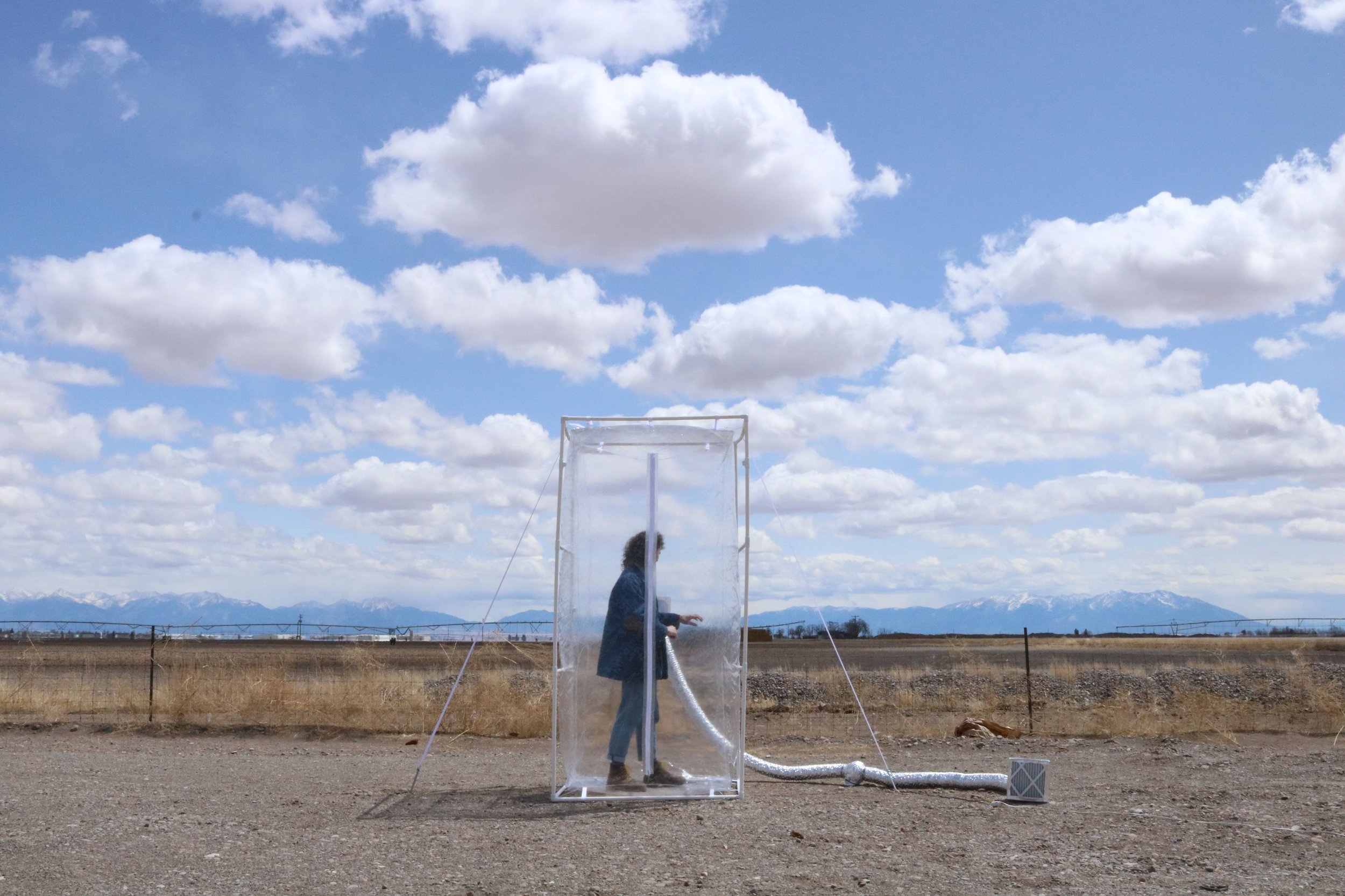 Vinyl, unmarked pcv pipe, thread, webbing, stakes, foil, metal duct, and air pumped through two HEPA